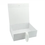 Тази сгъваема луксозна кутия е изработена от твърд картон каширана в бял цвят и матово покритие. Точните вътрешни размери на кутията са 31,5 х 24 х 10,5 см; Затварянето на кутия е решено с магнити и като декоративен елемент сме добавили панделка в цвета на кутията.