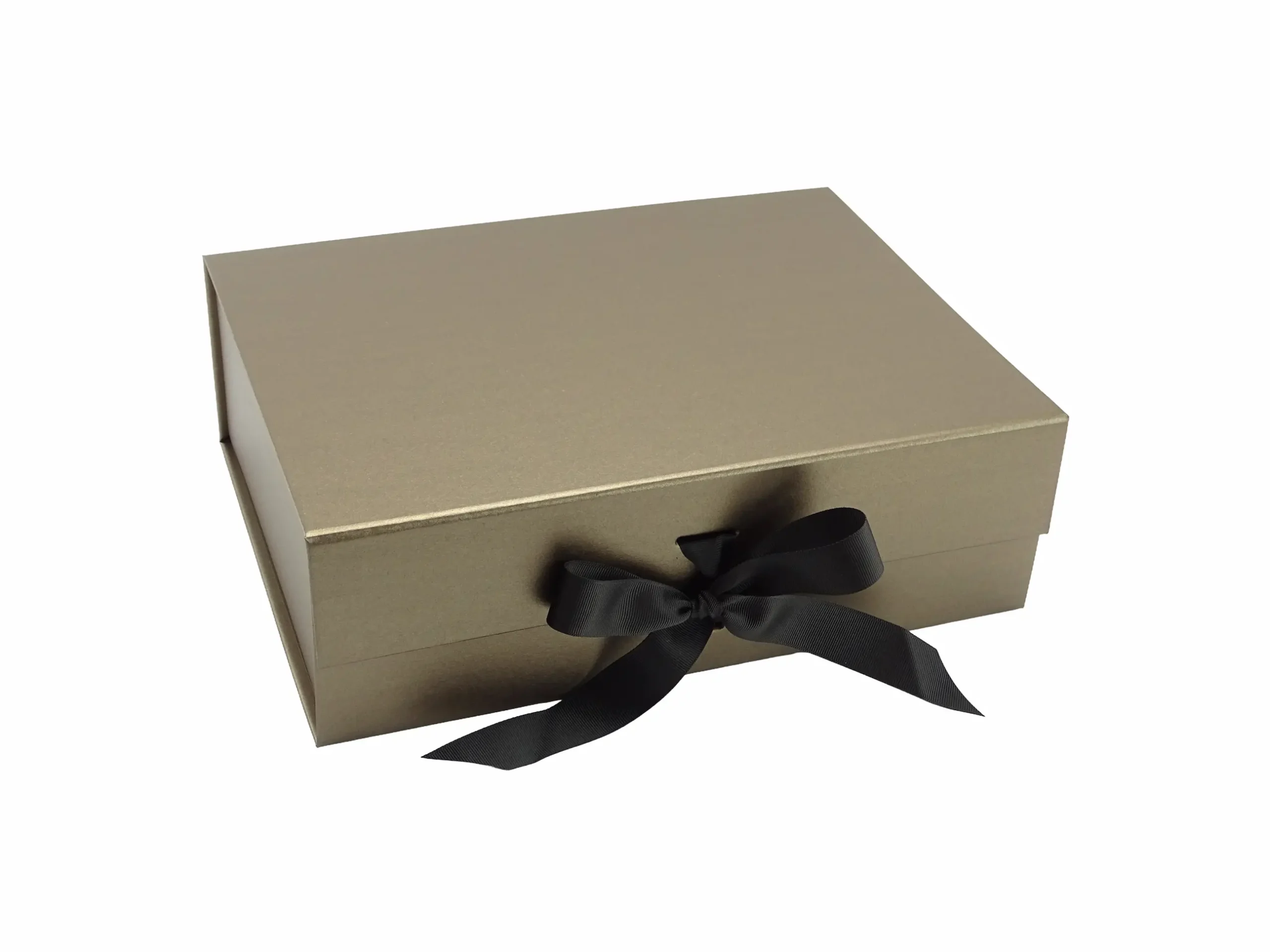 Тази сгъваема луксозна кутия е изработена от твърд картон каширана в бронзов цвят. Точните вътрешни размери на кутията са 31,5 х 24 х 10,5 см; Затварянето на кутия е решено с магнити и като декоративен елемент сме добавили панделка в цвета на кутията.