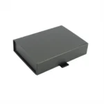 Тази сгъваема луксозна кутия е изработена от твърд картон каширана в черен цвят и матово покритие. Точните вътрешни размери на кутията са 17 х 12,5 х 3,5 см; Затварянето на кутия е решено с магнити и като декоративен елемент сме добавили панделка в цвета на кутията.