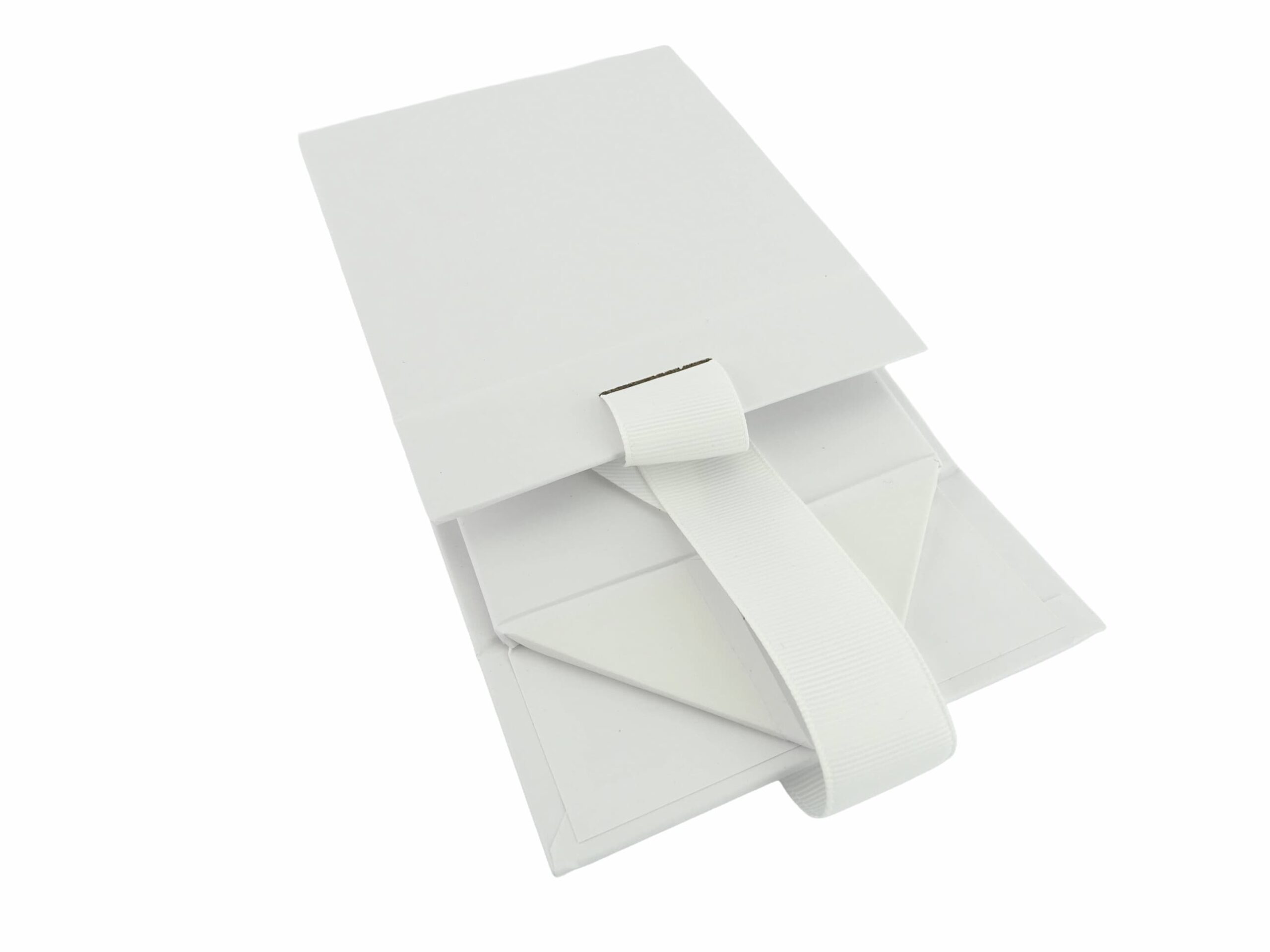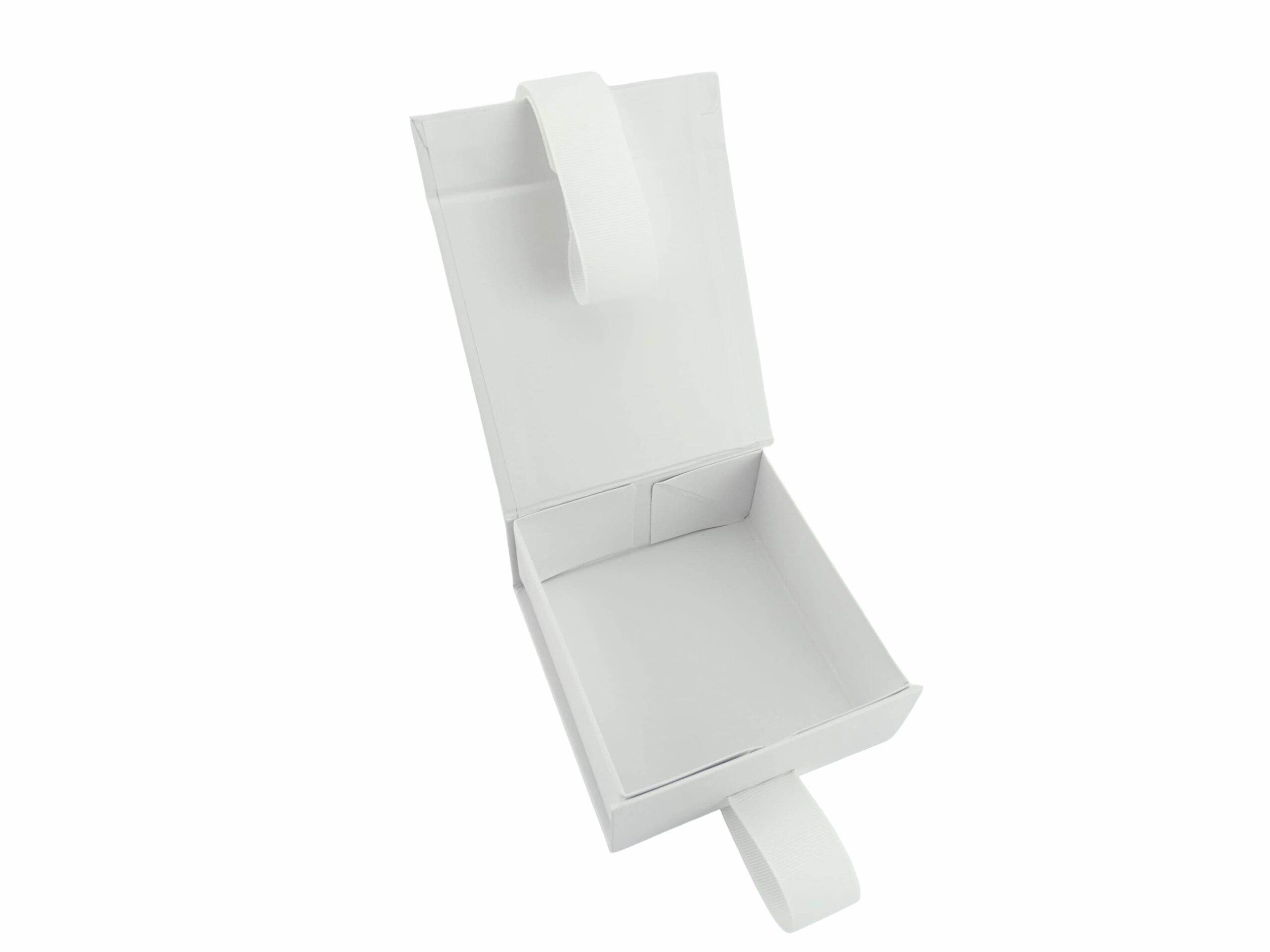Тази сгъваема луксозна кутия е изработена от твърд картон каширана в бял цвят и матово покритие. Точните вътрешни размери на кутията са 9,5 х 11 х 4,5 см; Затварянето на кутия е решено с магнити и като декоративен елемент сме добавили панделка в цвета на кутията.