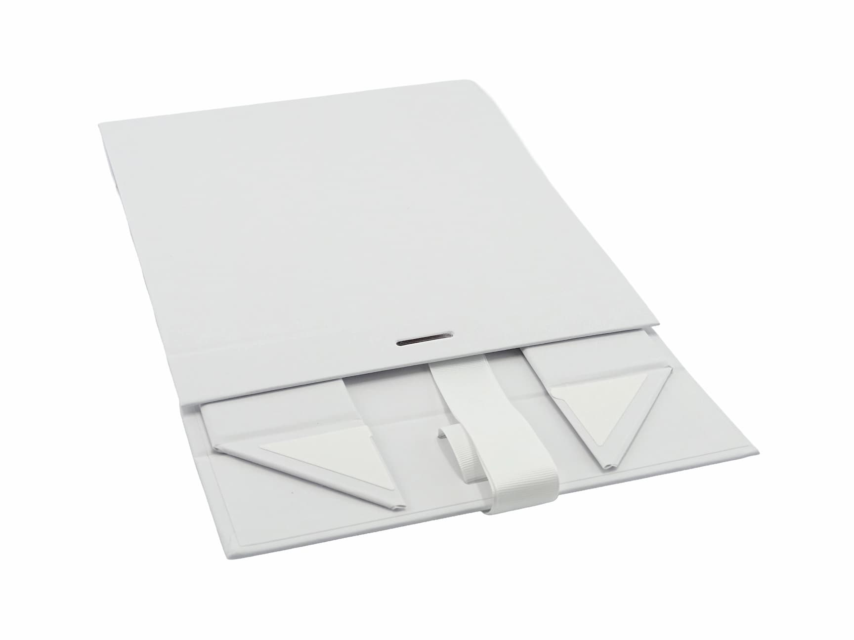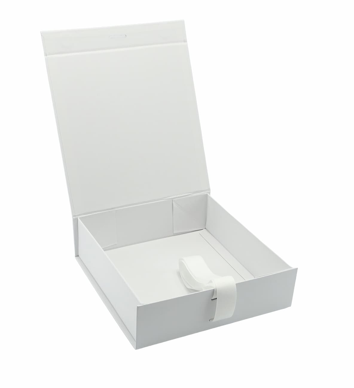 Тази сгъваема луксозна кутия е изработена от твърд картон каширана в бял цвят и матово покритие. Точните вътрешни размери на кутията са 21 х 22 х 6 см; Затварянето на кутия е решено с магнити и като декоративен елемент сме добавили панделка в цвета на кутията.